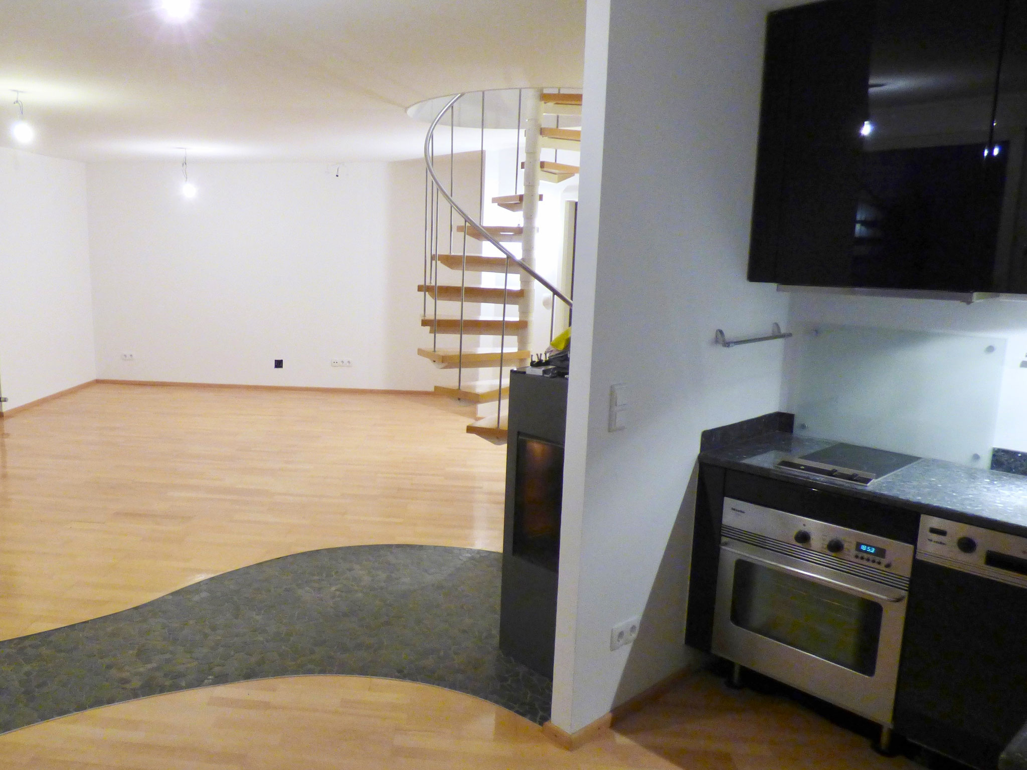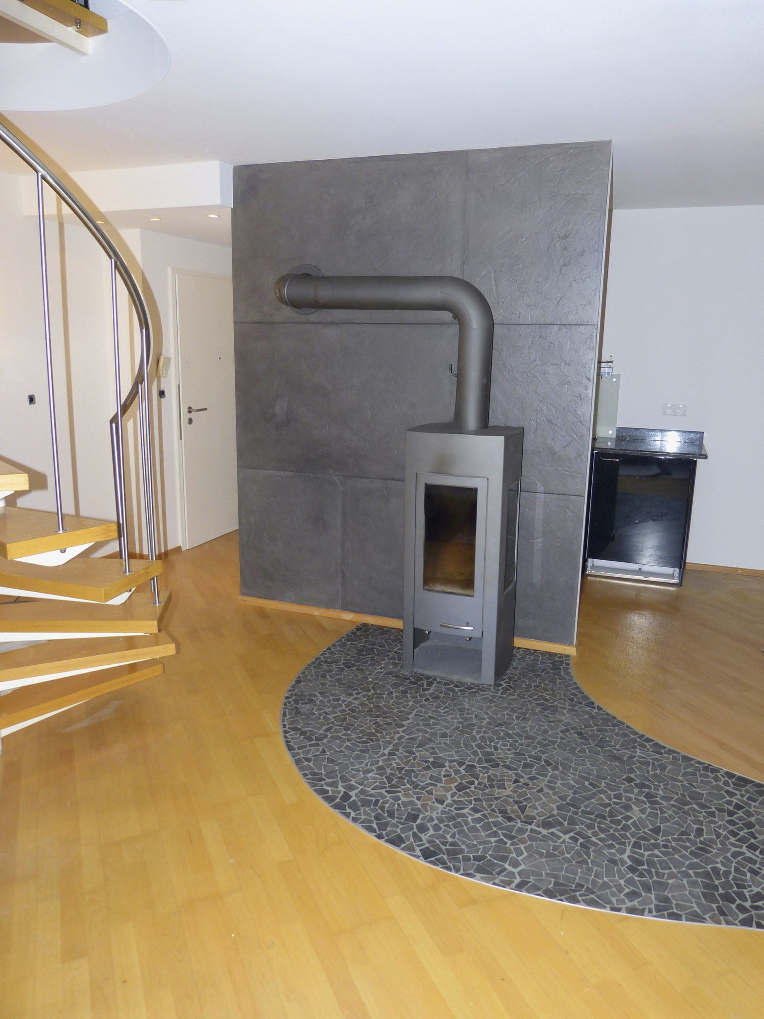 Die Wohnung ist mit Parkettfußboden ausgestattet, eine mit Steinmosaik gestaltete Fläche führt zum Gemütlichkeit verbreitenden Schwedenofen. Die Kaminwand dahinter ist in Schieferoptik gehalten.