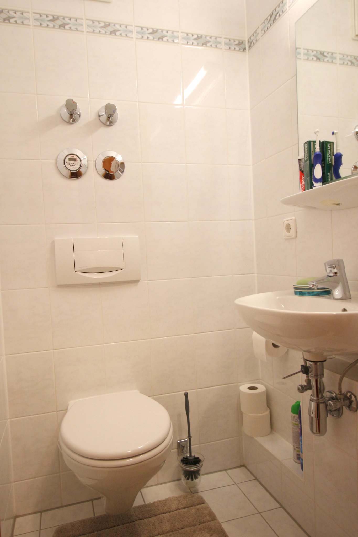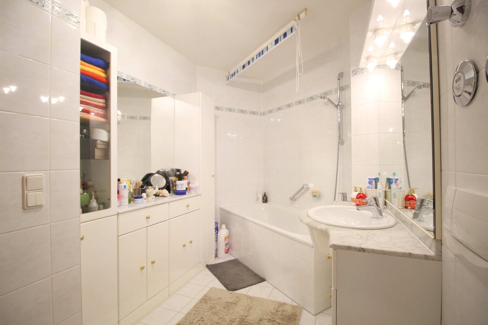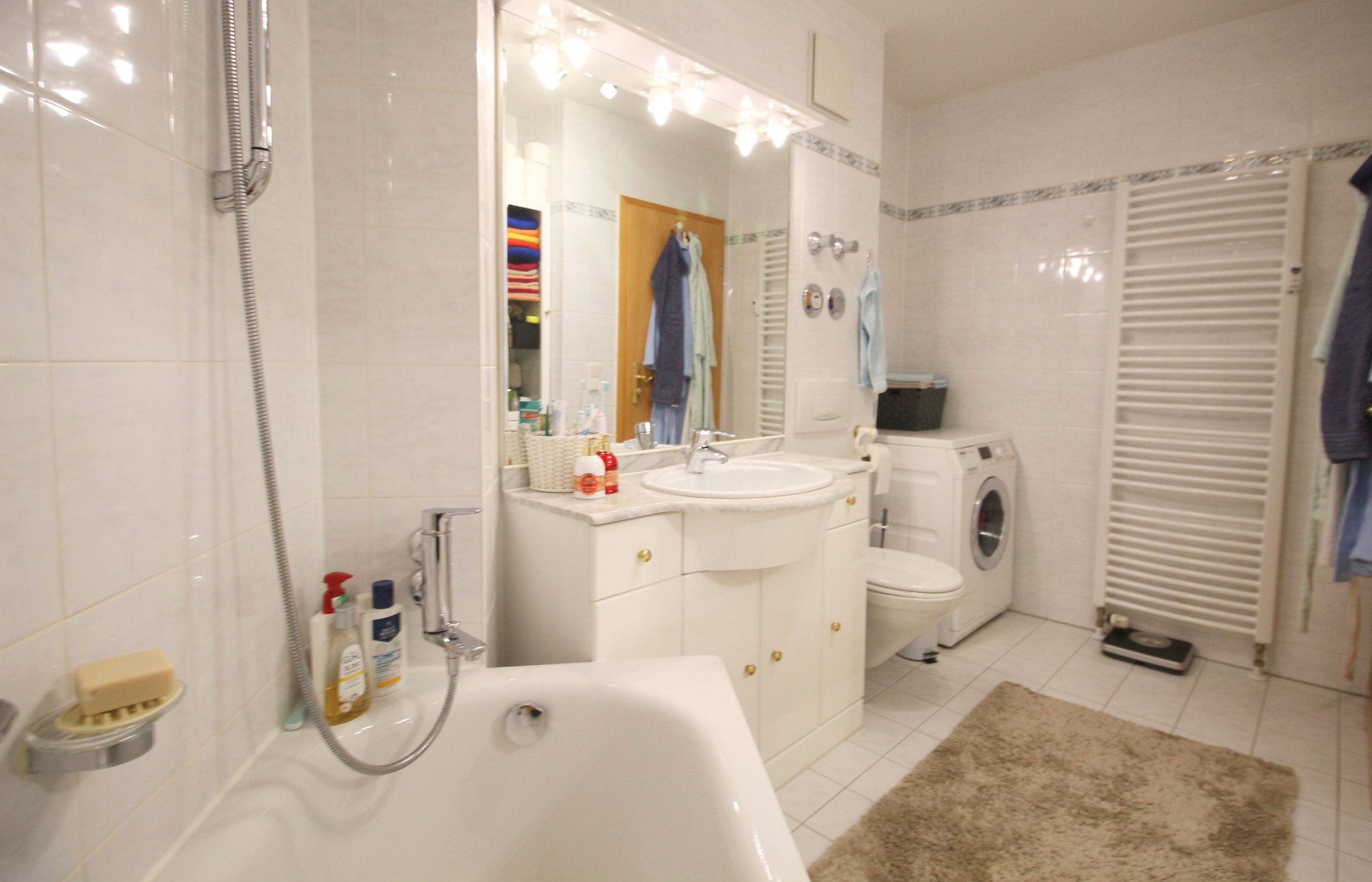 Das Badezimmer ist von angenehmer Größe und zeitgemäß hell gefliest. Die Duschwanne im Eck, der Handtuchheizkörper sowie der extragroße Waschtisch mit Marmorplatte lassen es luxuriös wirken. Ein Waschmaschinenanschluss ist vorhanden (Trockenraum in der WEG).