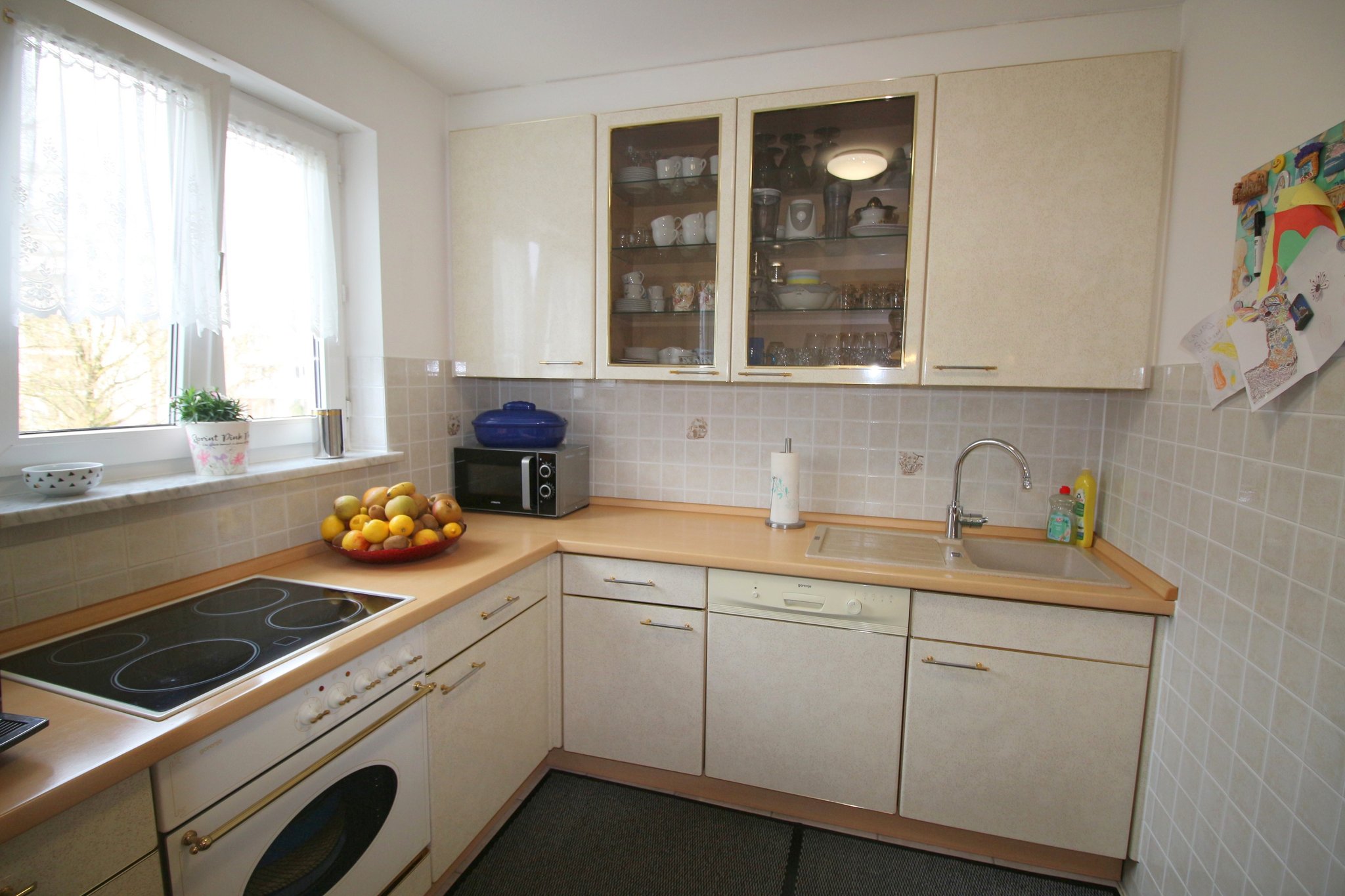 Die neben dem Wohnraum befindliche Küche ist mit einer Einbauküche mit großzügiger Arbeitsfläche ausgestattet.