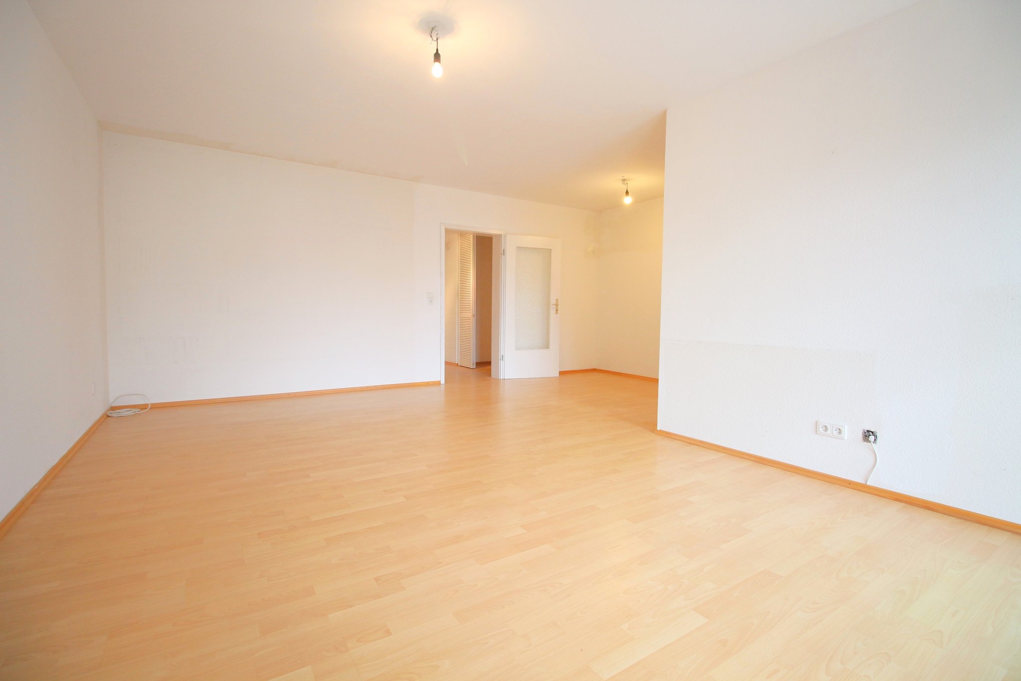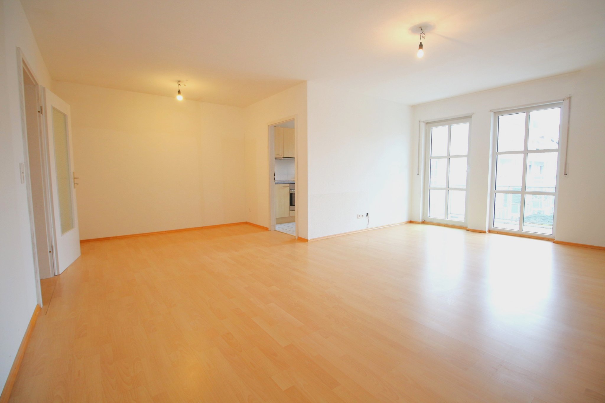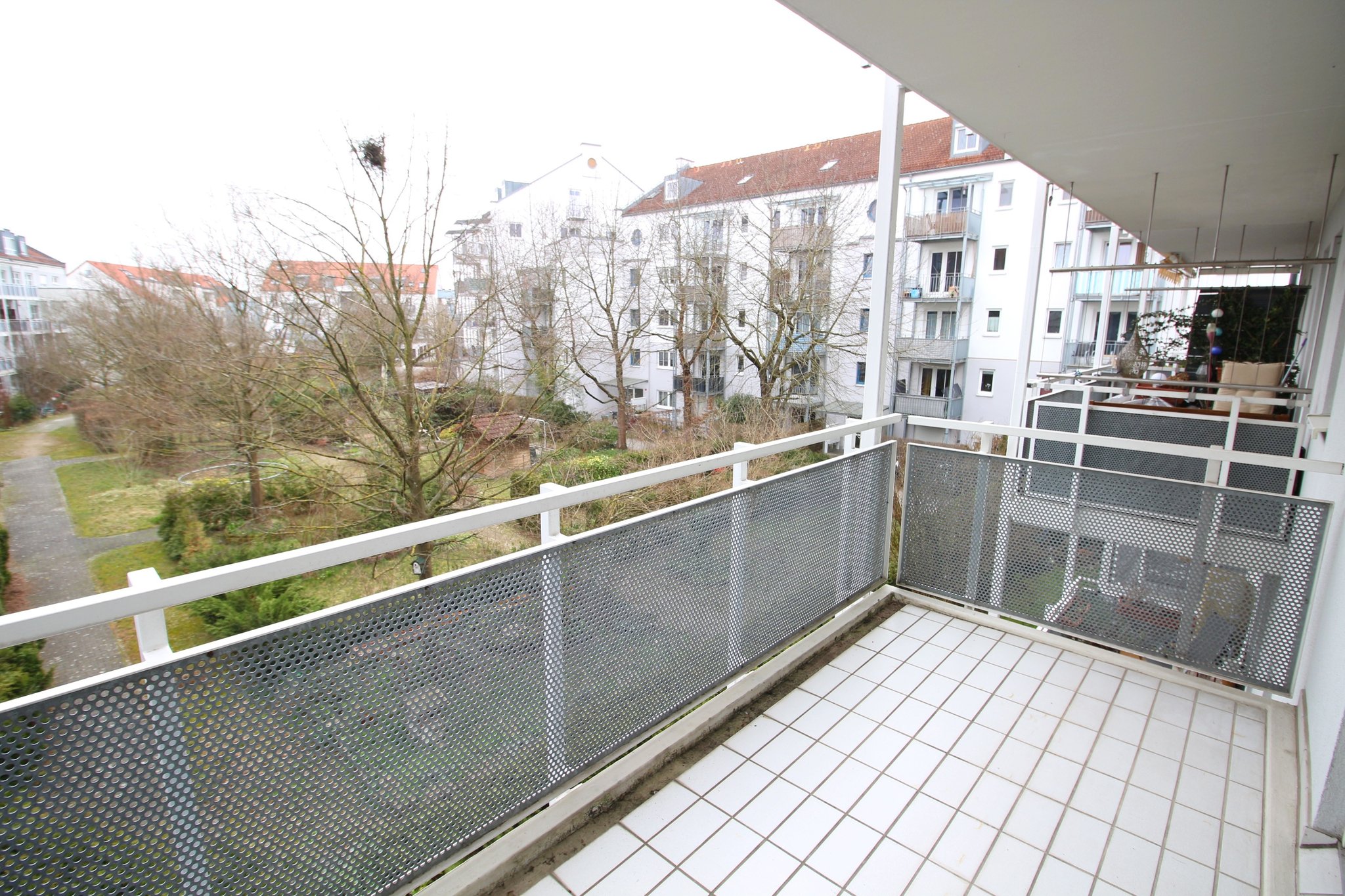 Der besonders großzügige Wohnraum mit attraktiver Fensterfront wird um den sonnigen Balkon (Südausrichtung) ergänzt. Der Blick geht in den begrünten Innenhof.