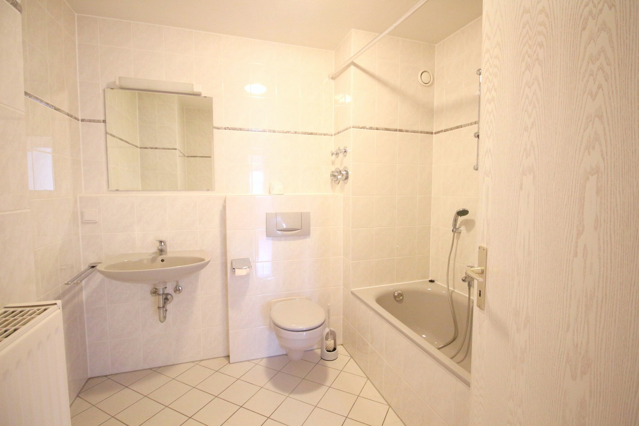 Linker Hand befindet sich das hell geflieste Wannen-Bad.