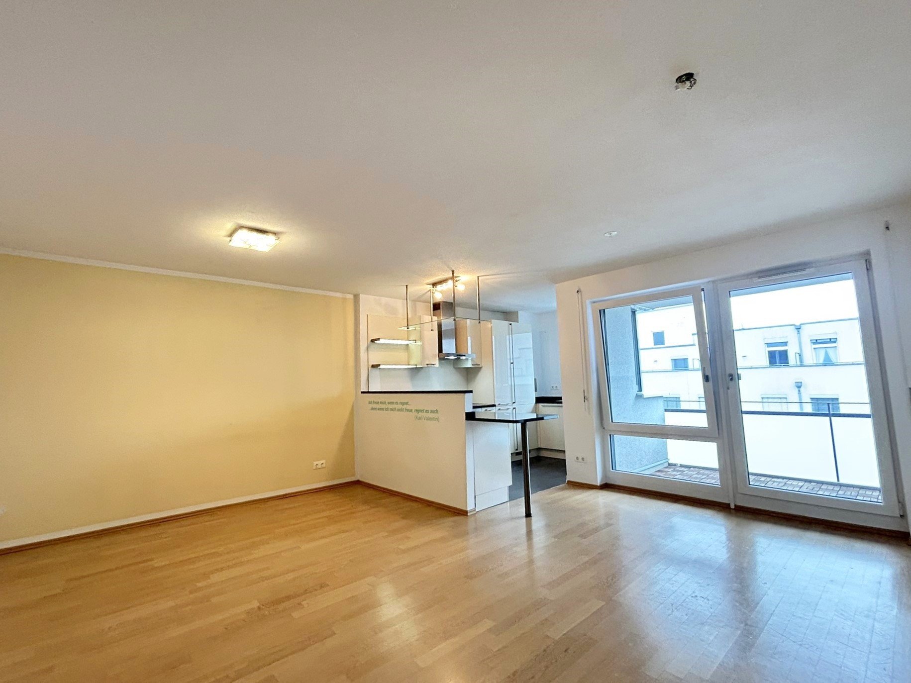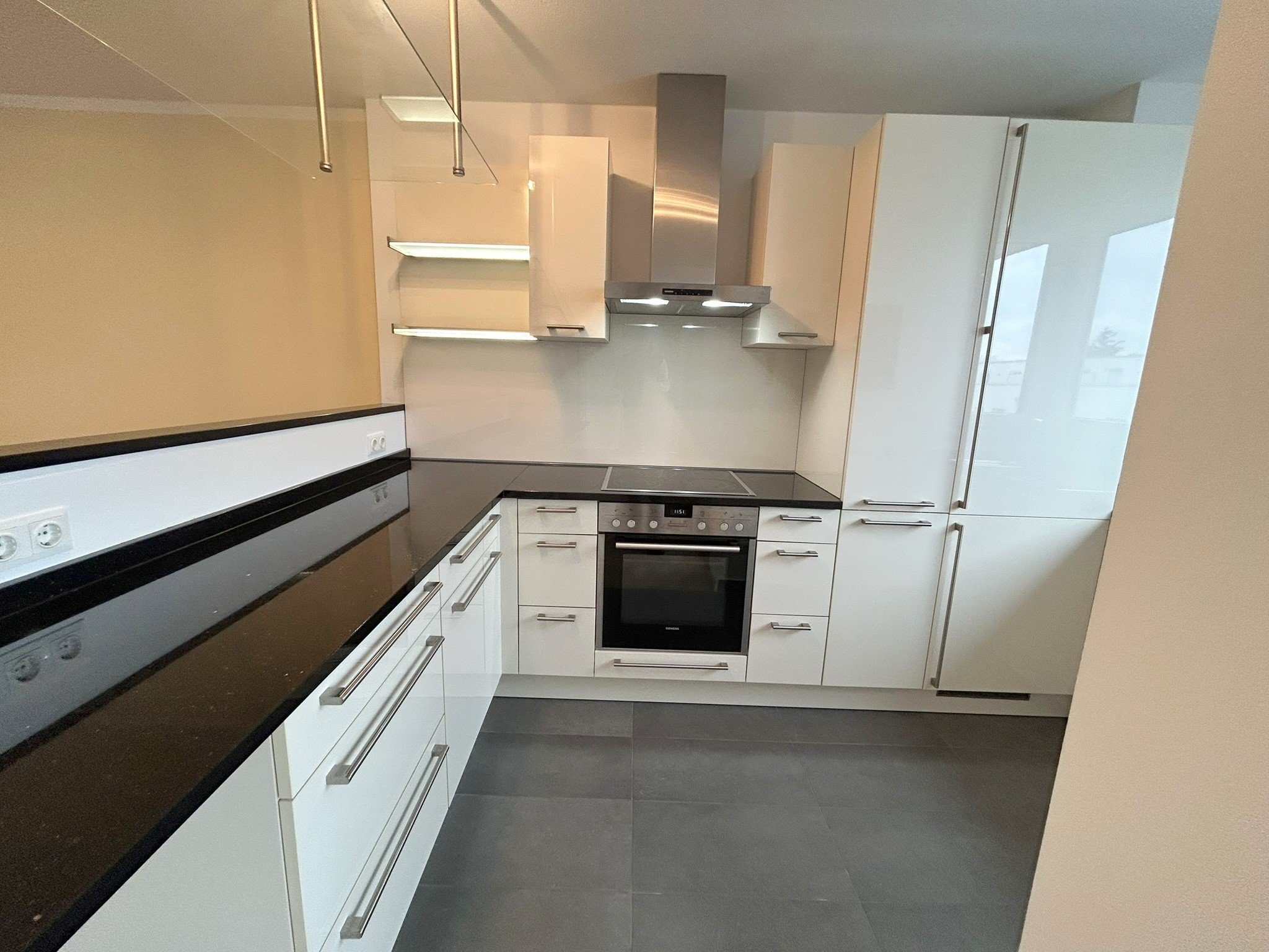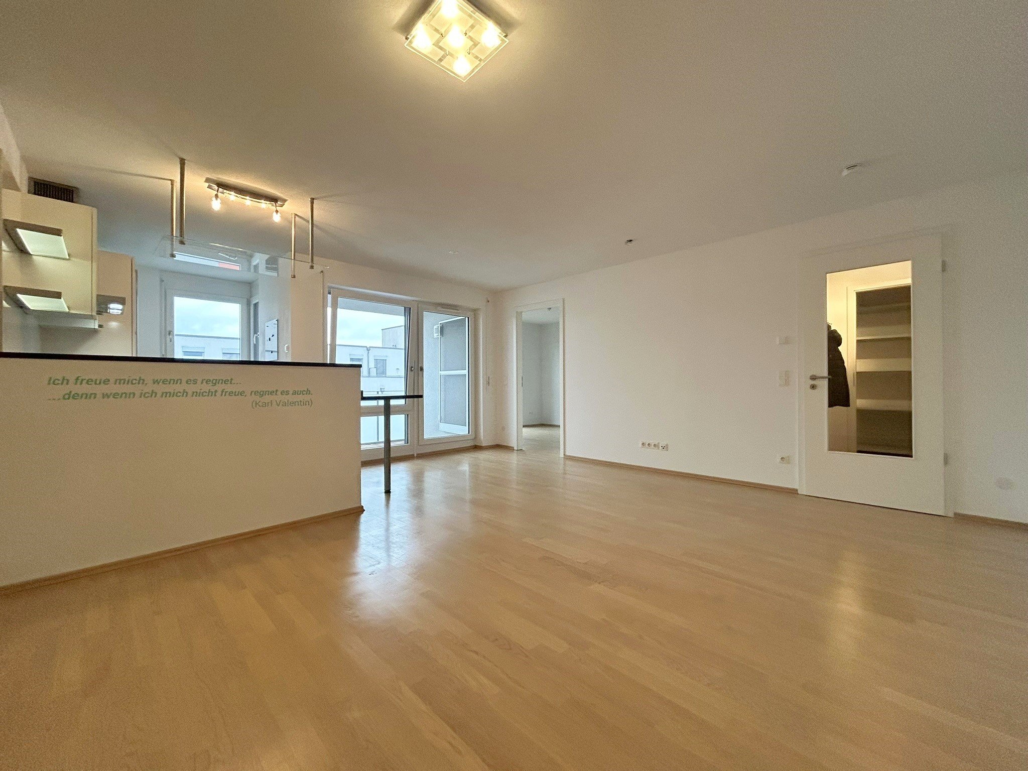 Der großzügige Wohnraum besticht mit der hochwertigen, offenen Küche mit Tresen und Granitplatte, Parkettboden sowie dem Zugang zur überdachten Loggia.
