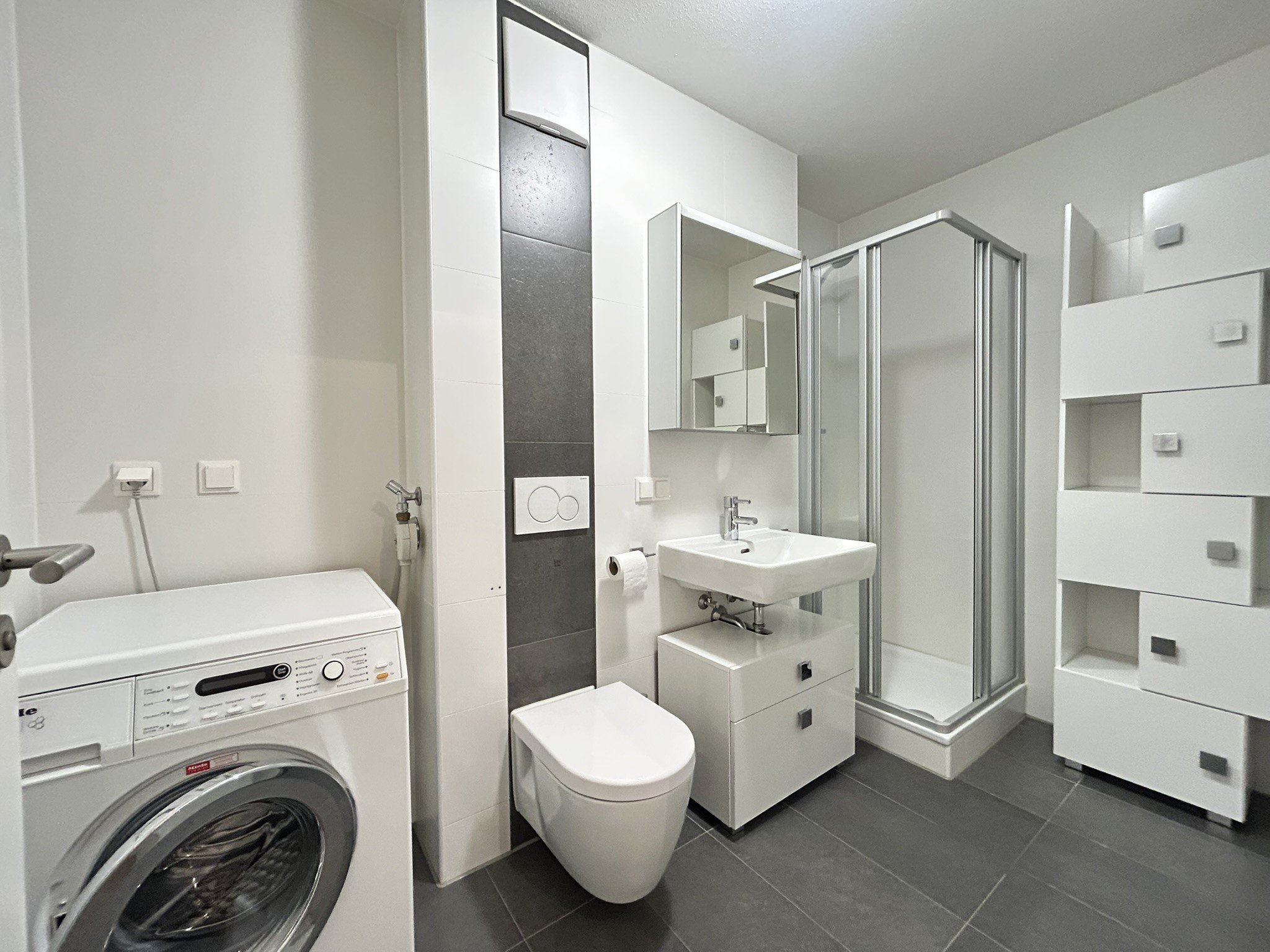Das modern geflieste Badezimmer ist ausgestattet mit Dusche, WC, Waschbecken und Handtuchheizkörper. Darüber hinaus ist die Möblierung und die Waschmaschine der Qualitätsmarke Miele inklusive.