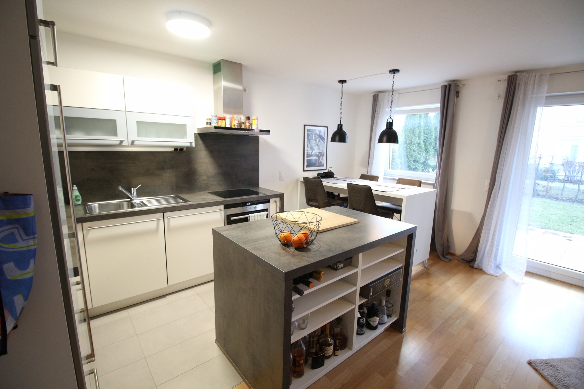 Einbauküche ausgestattet. Angrenzend befindet sich die schöne Terrasse mit eigenem Garten in