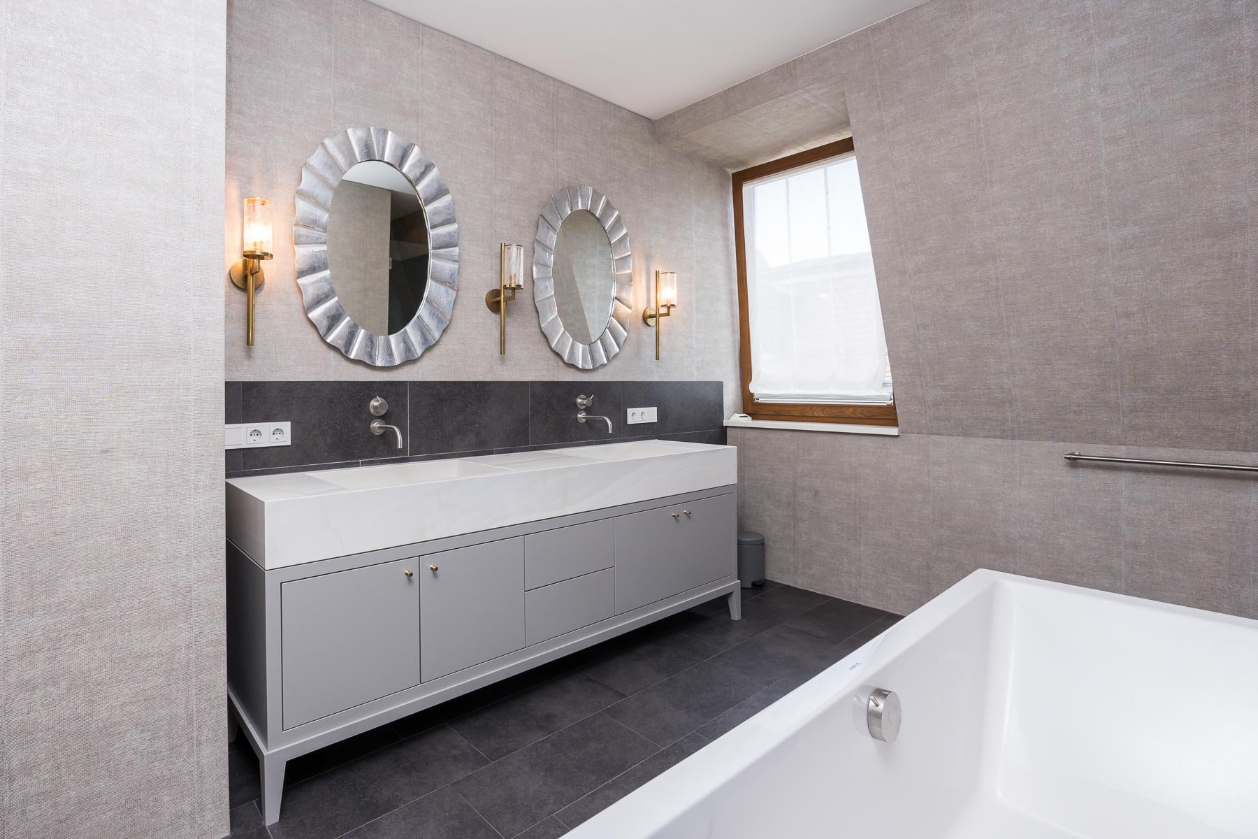 Doppelwaschtisch, Badewanne, XL-Dusche und Fenster.